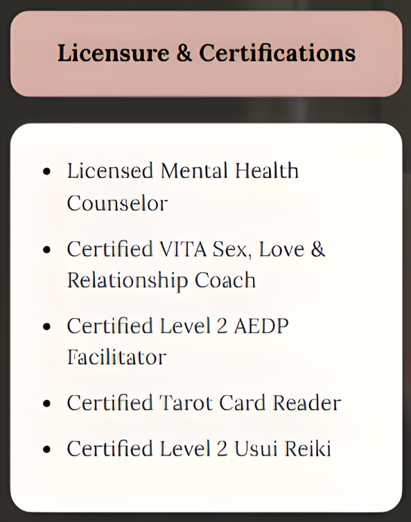 Kayle’s background brings together decades of experience, advanced clinical training, sacred sexuality work, and spiritual practice.